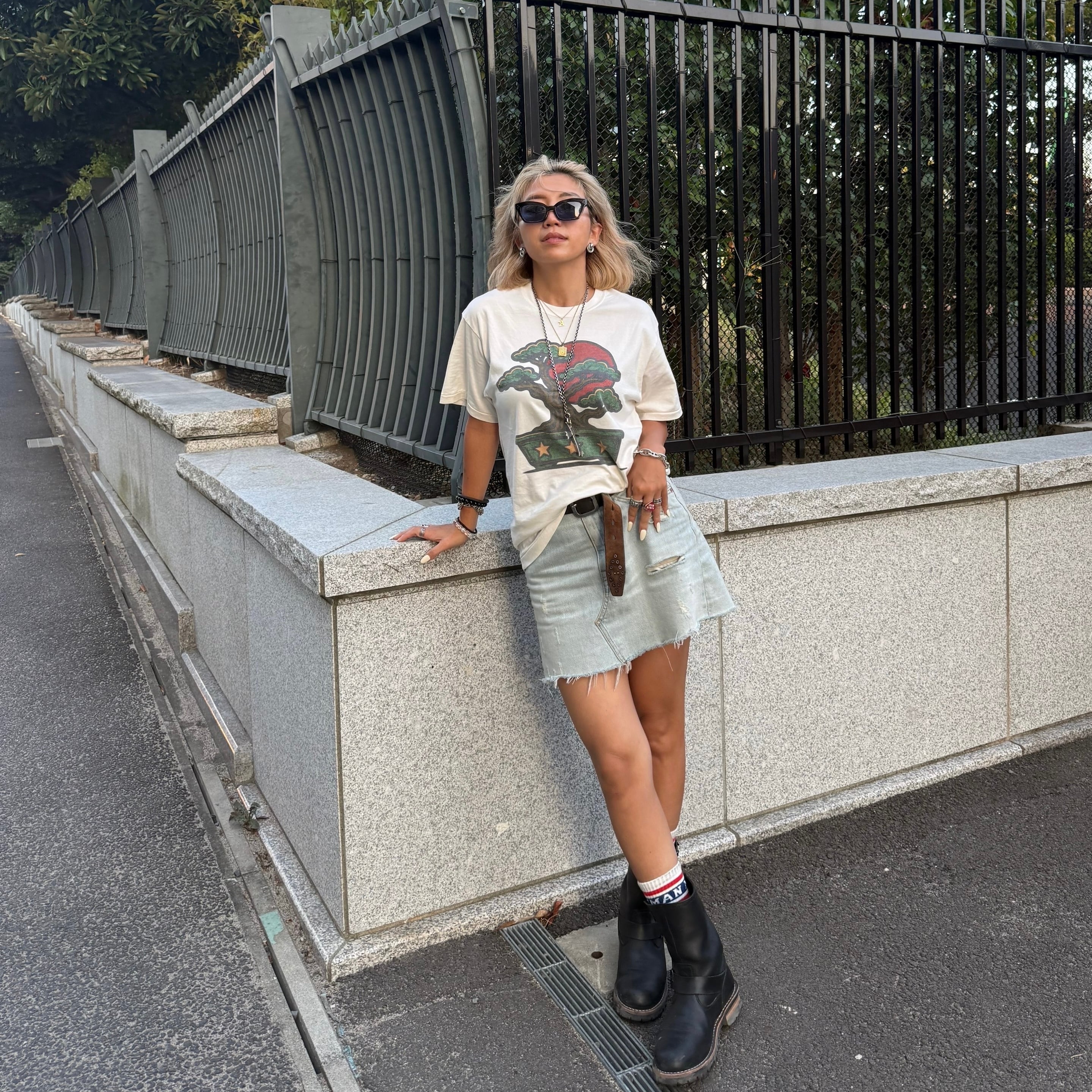 フロントにはブランドを象徴する盆栽モチーフを、ウォッシュアウトという特殊技法でプリント。一度プリントしたのち、バイオウォッシュでインク表面を洗い落とし、さらにタンブラー加工で毛羽立たせることで、古着の染み込みプリントのように生地へ自然に馴染ませています。