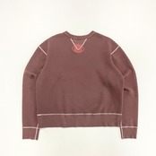 縫製は、ほぼすべてにフラットシーマを使用。縫い代のごろつきを抑え、着用と洗濯を重ねるほどに身体へなじんでいきます。前後のVガゼットや長めの袖リブなど、ヴィンテージスウェットのディテールを踏襲しつつ、着丈はやや短めに設定。無骨さと現代的なバランスを両立したシルエットに再構築しています。
