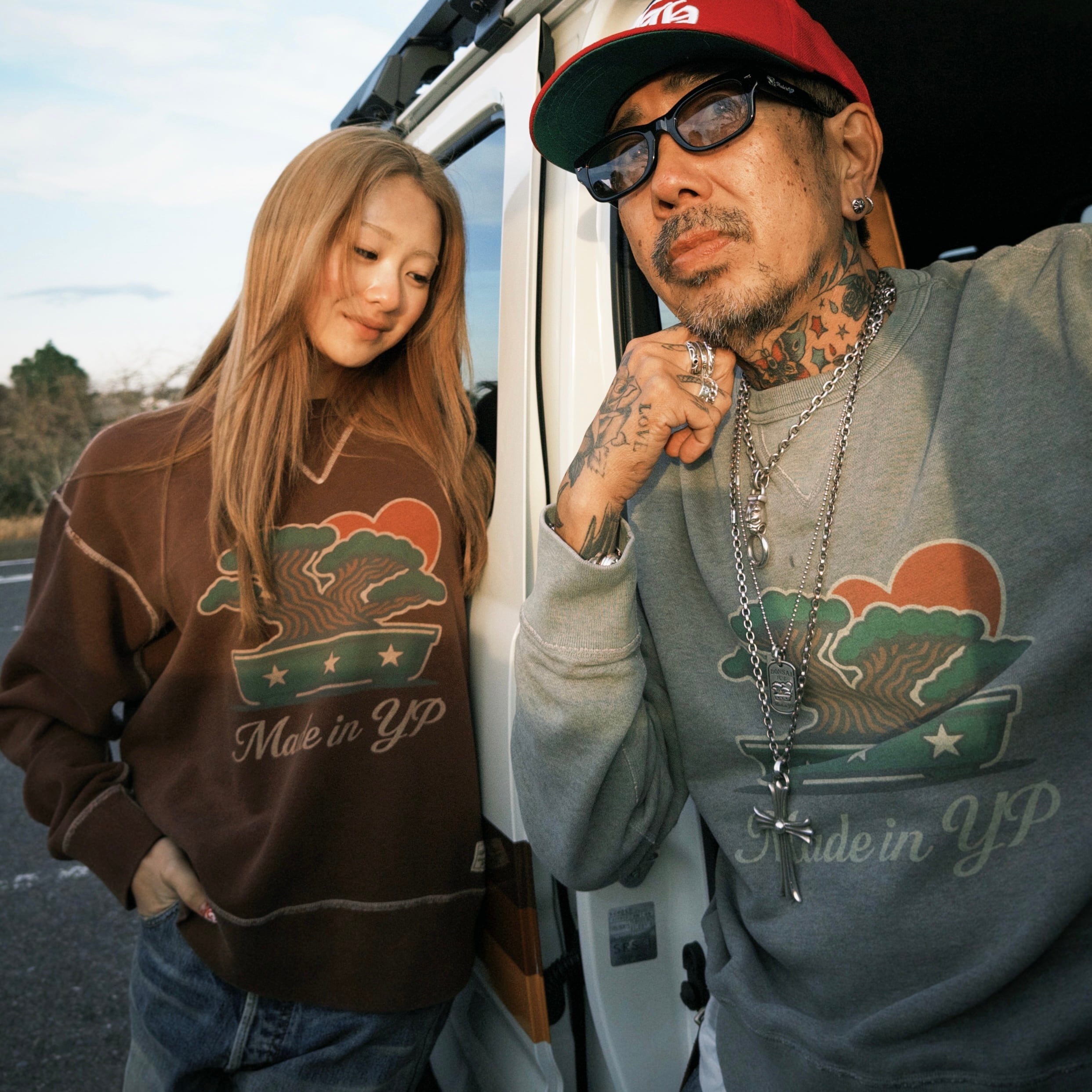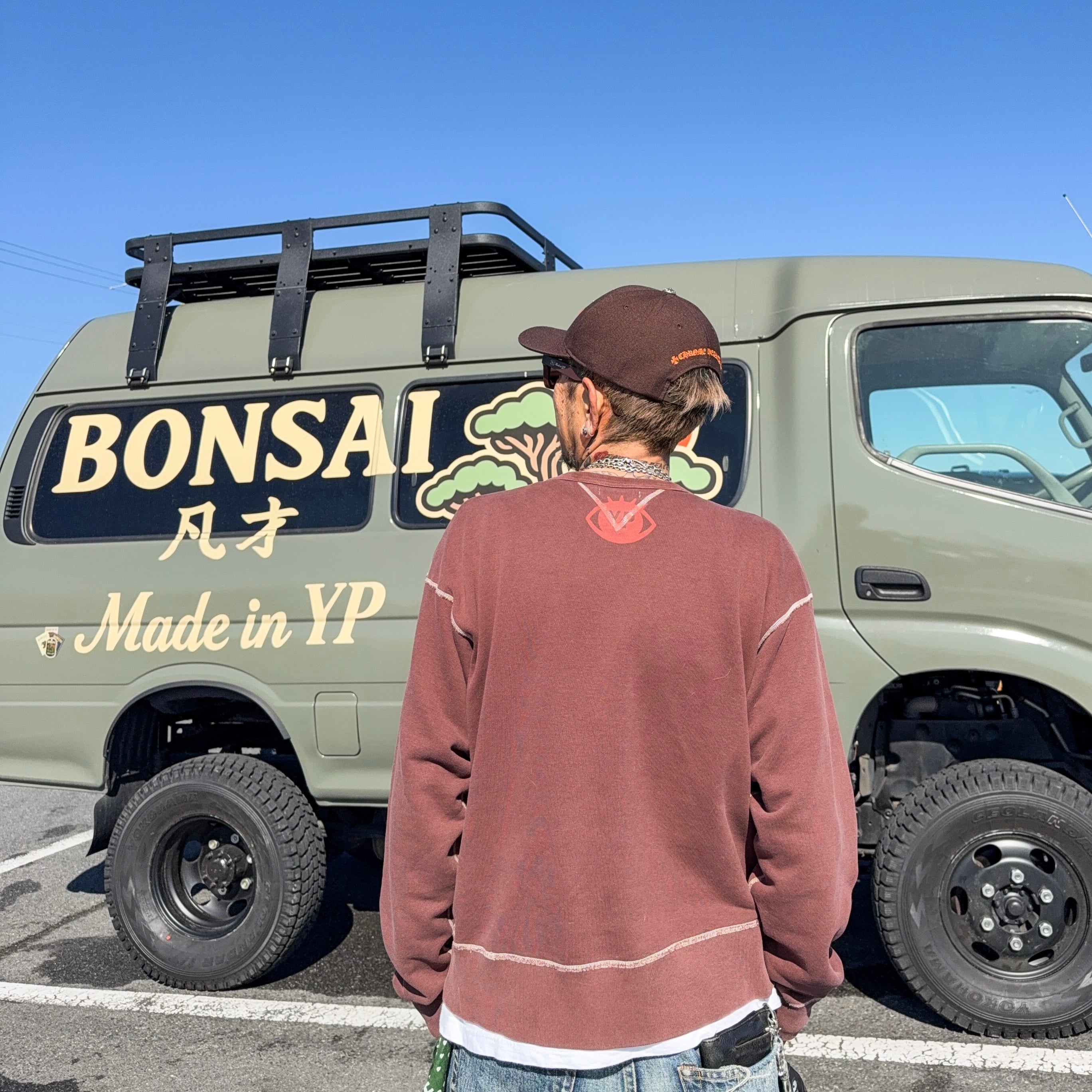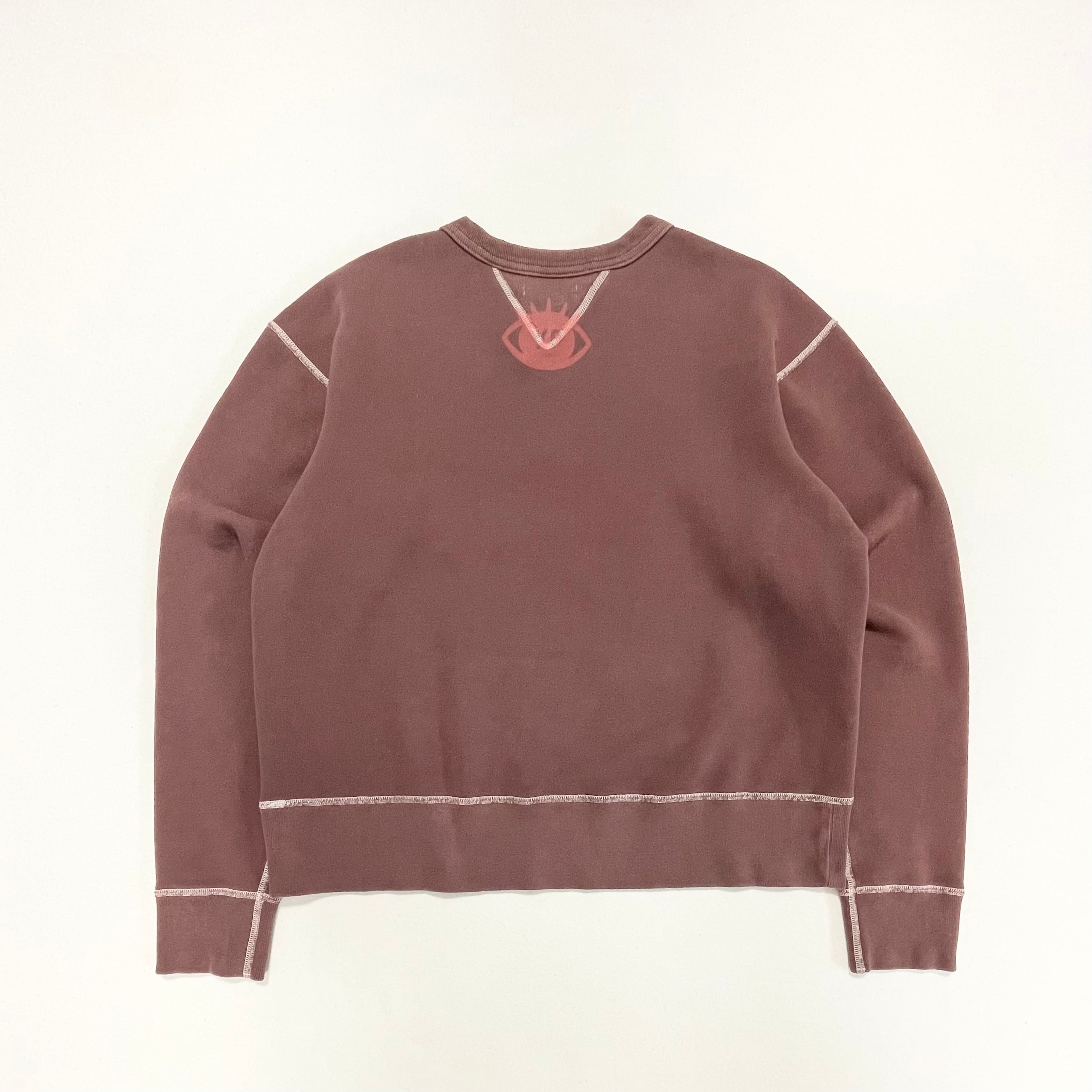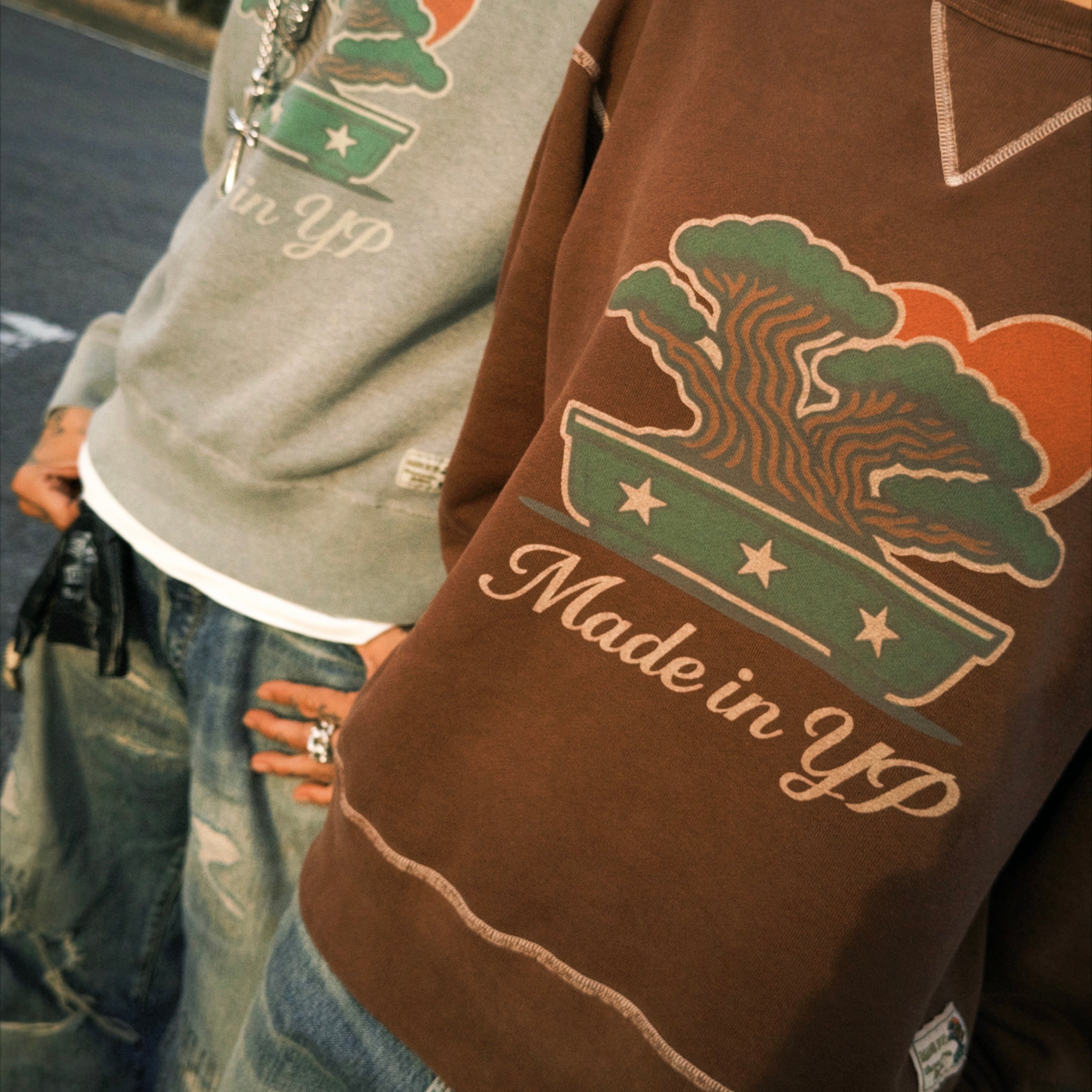 生成りの生地で作られたスウェットを硫化染めでブラウンに染め上げ、MADE IN YPのアイコニックなグラフィックを染み込みプリントで表現。さらにストーンバイト加工を加えることで、長年着込まれたヴィンテージスウェットのような風合いと自然なフェード感を再現しました。