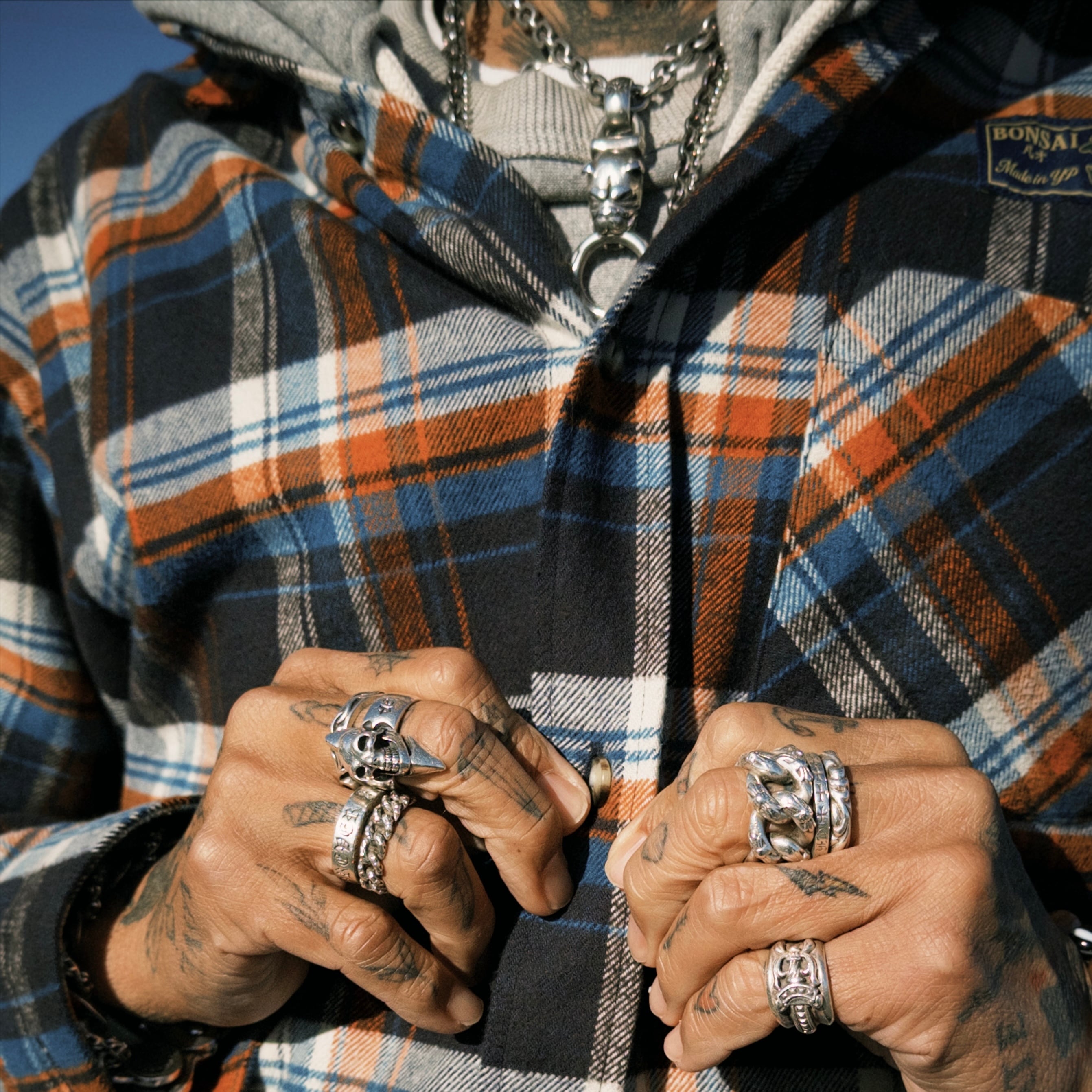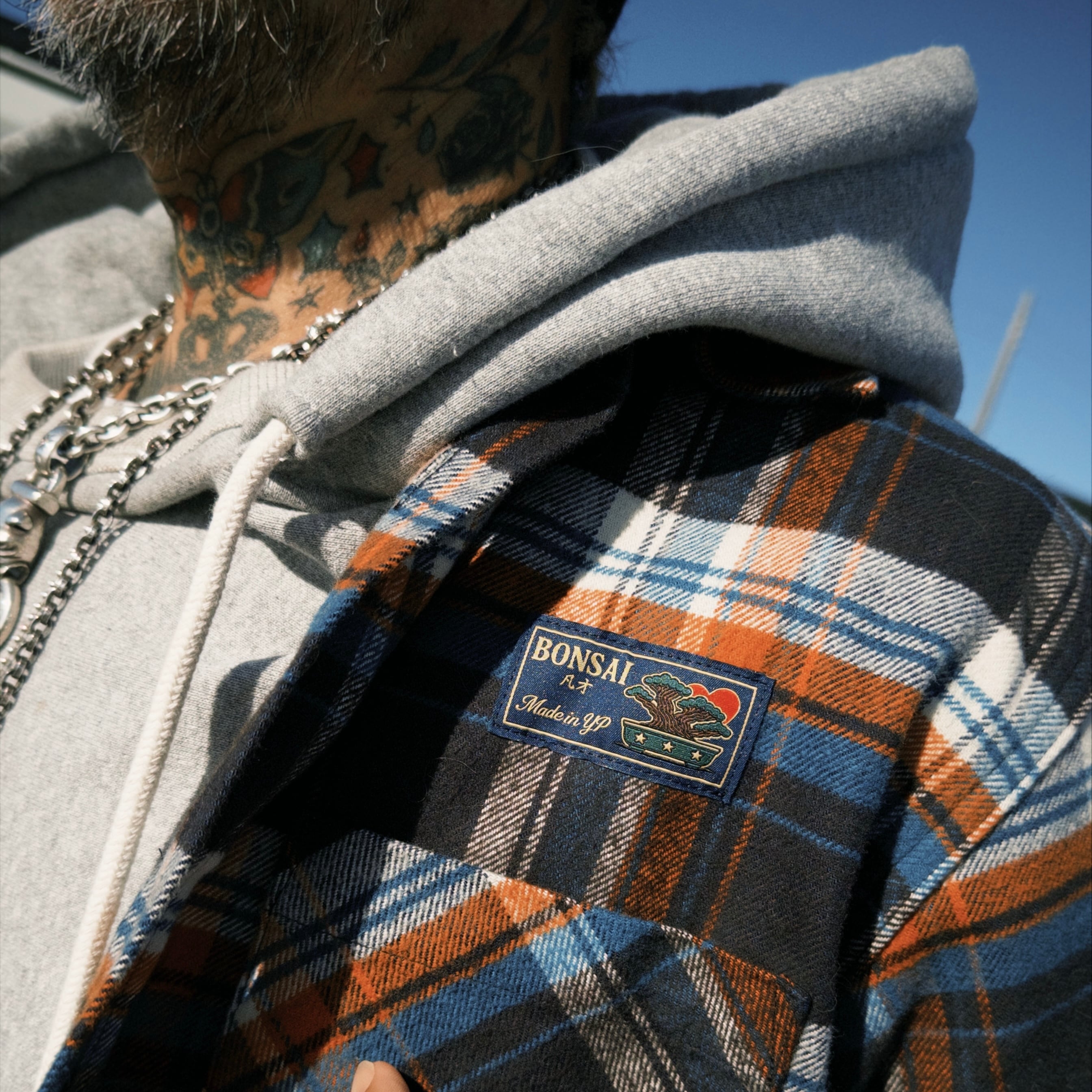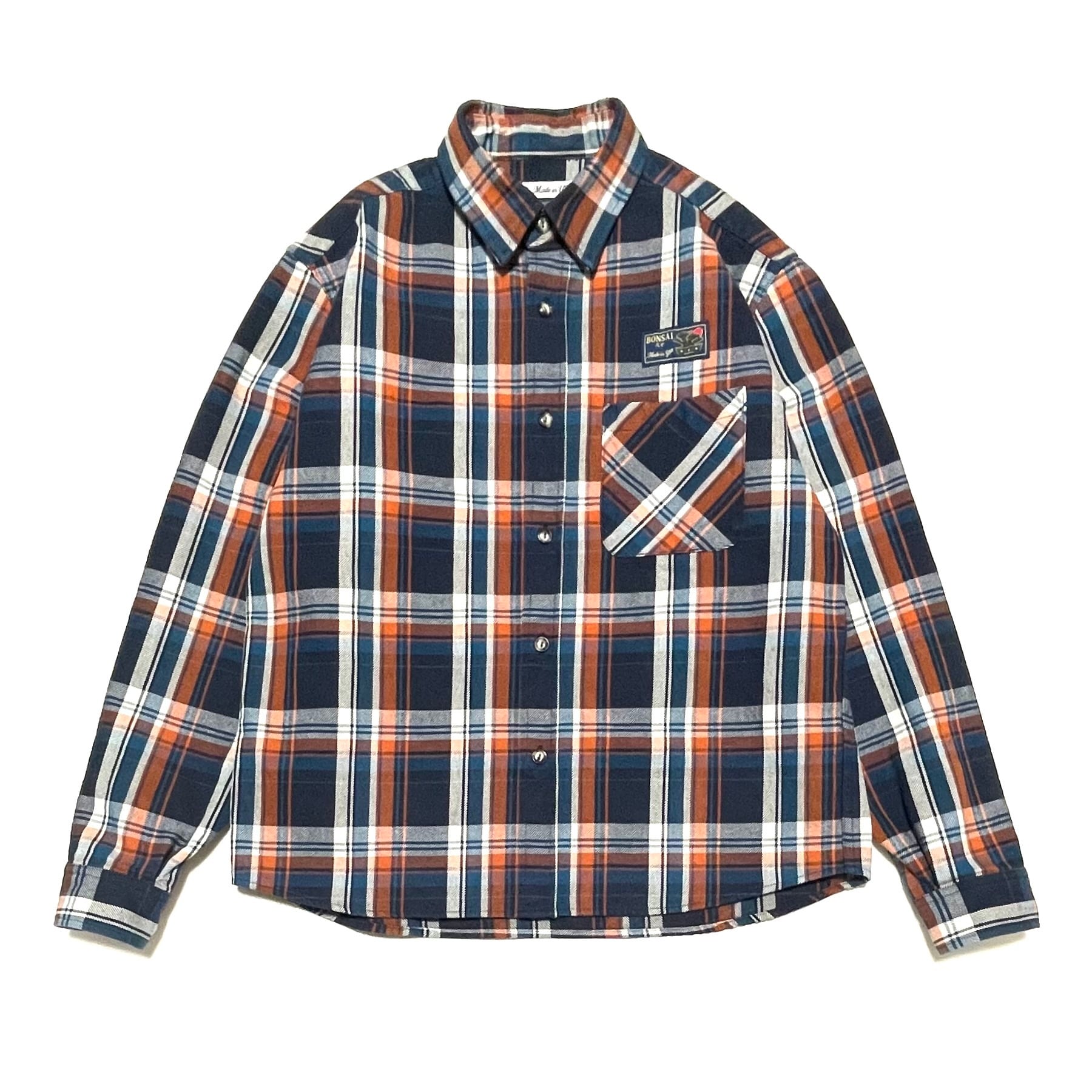ネイビーを基調に、差し色として効かせたオレンジが印象的なチェック柄。オーセンティックな佇まいの中に、さりげないアクセントを添えています。